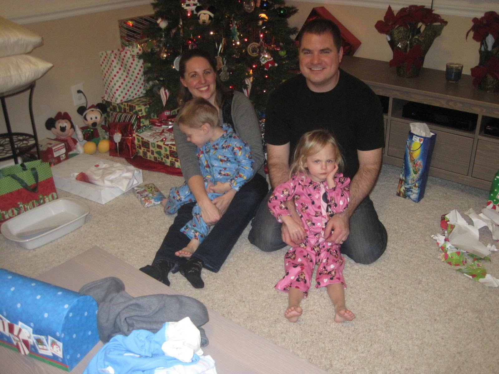Christmas morning started off with some excitement after we finally pulled ourselves out of bed.  By this point the kids had been "sleeping" with us going on 4 nights straight.  We started opening presents, but poor Maggie was miserable and half way through, we could barely get her off the couch.